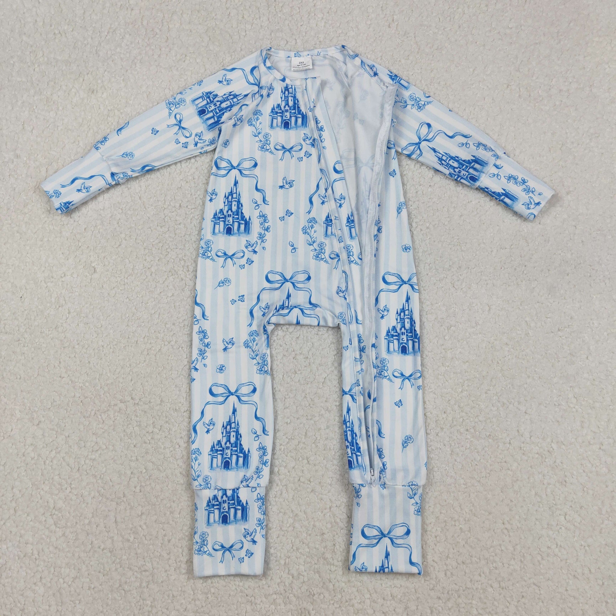 Castle Bow Pattern Blue Stripe Girls Fall Romper