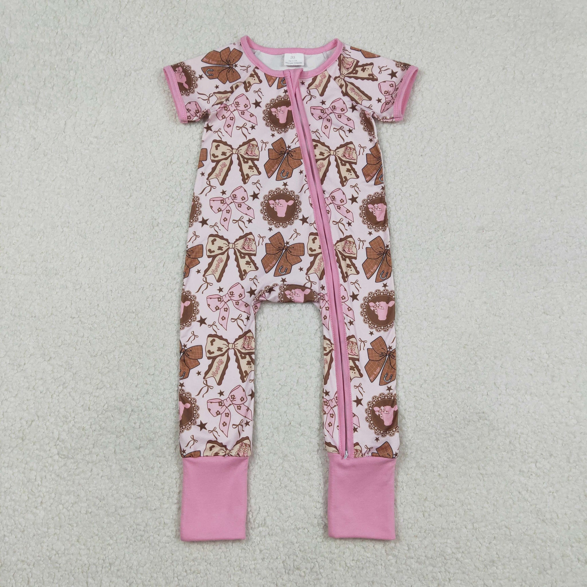 Cow Boots Bow Pattern Pink Girls Summer Romper