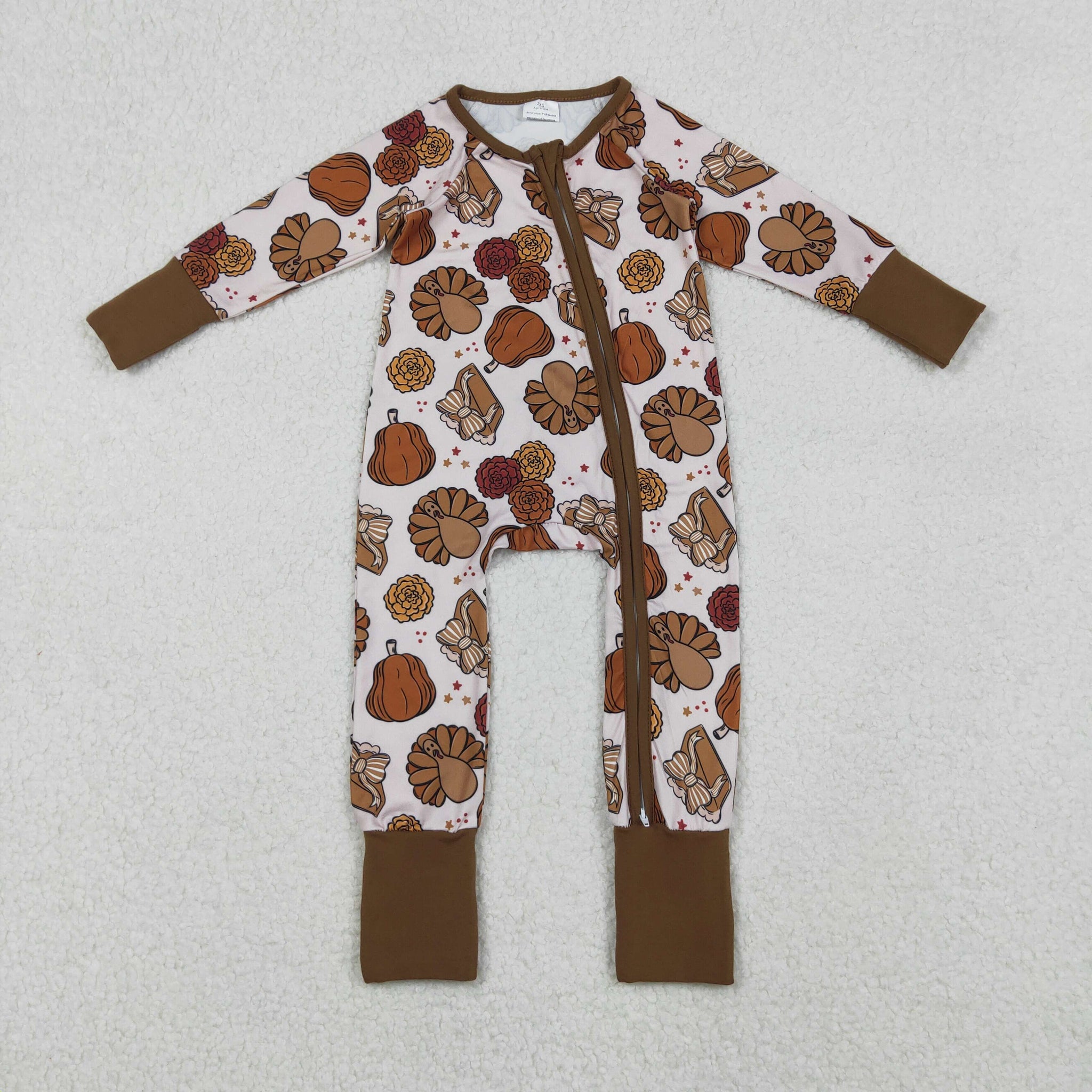 Turkey Pumpkin Floral Brown Girls Thanksgiving Romper